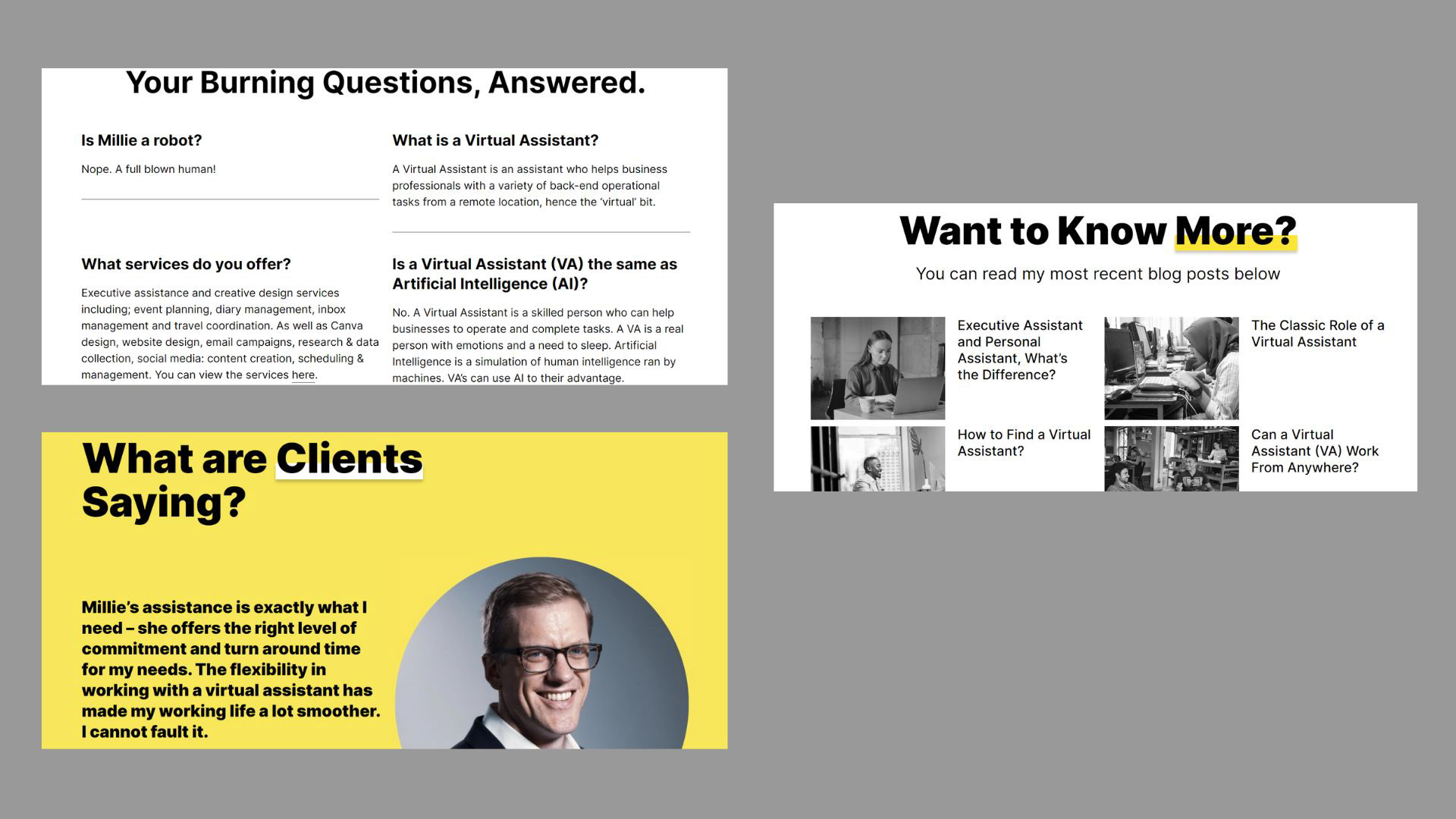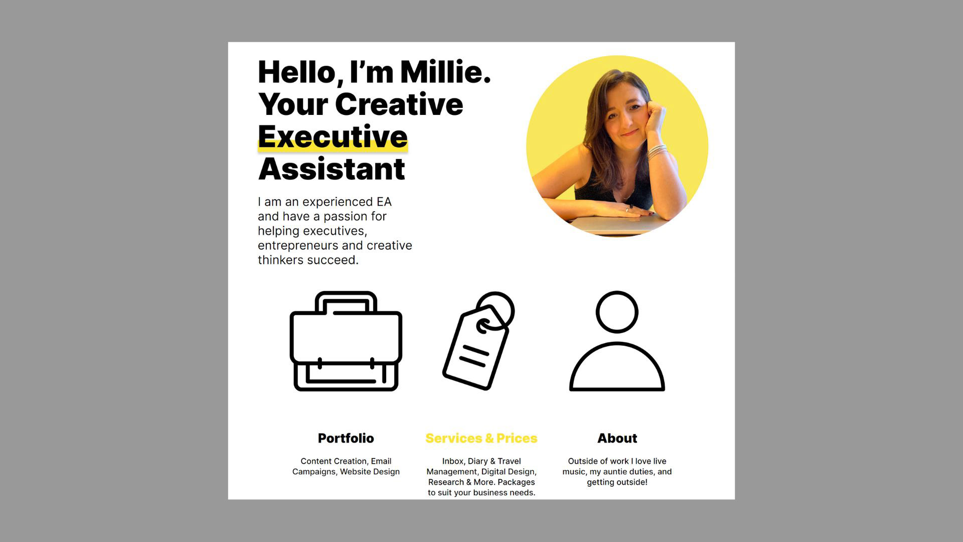This website for Millie successfully met the needs of time-poor business owners by providing concise and essential information in a professional and accessible manner. The combination of creative and organizational solutions is clearly highlighted, ensuring potential clients can quickly understand and engage with the services offered. This project exemplifies my ability to create functional, aesthetically pleasing, and user-centric websites.