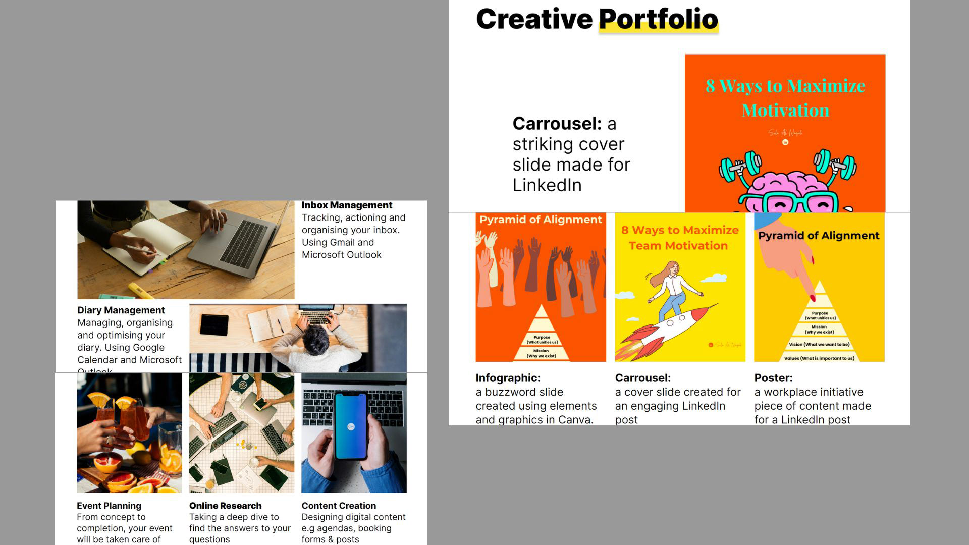 Organizational solutions: It showcased all the services she offers to make the lives of entrepreneurs and creative professionals easier quickly and efficiently, like inbox management, diary management, travel coordination, online research, event planning, content creation, social media management, email campaigns, and website design as well as package prices for each service.